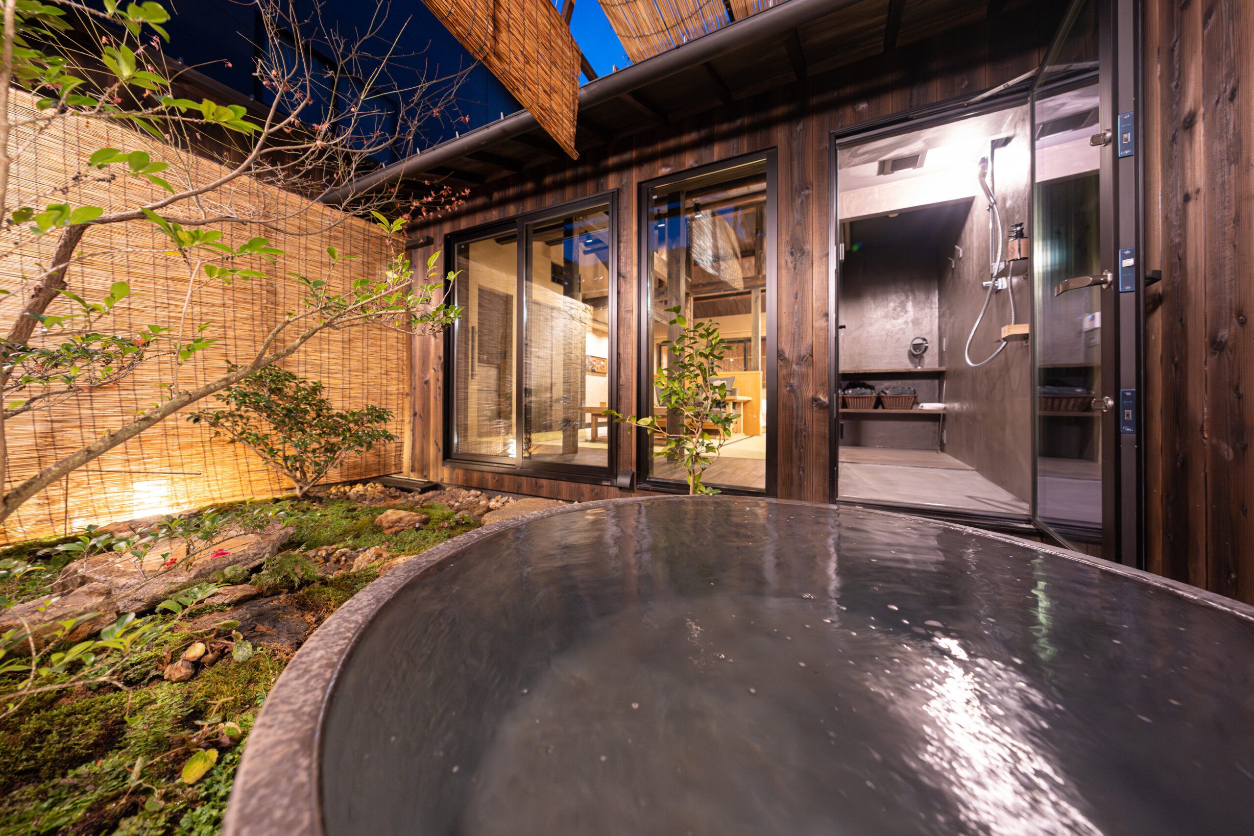 京町家の風情を残しつつ、モダンな快適さを追求した「束」。客室には、プライベートな空間で湯浴みを楽しめる客室露天風呂をご用意。